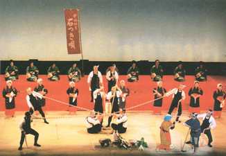 「石つき唄」は、家屋新築工事の地固め作業の際に唄われた仕事唄です。昔は新築となると、近所の人や親類など、村人が大勢集まり、基礎工事などを手伝いました。その時、建主からの振る舞い酒などを飲み、威勢よく突きながら唄う「石つき唄」は仕事唄であるとともに、建てる家の繁栄を祈る祝い唄の性格も持っています。