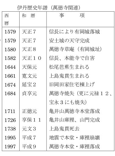 「亀井山萬徳寺由緒沿革畧記」(4代住職了願筆)によれば、現在の萬徳寺は有岡城落城以前にすでに“正覚山真光寺”として存在し、親鸞末寺の念仏道場として了秀が住職を勤めていました。了秀は荒木村重とは茶道友達として深い親交が有り、有岡城の落城とともに討ち死にし、真光寺も廃寺となりました。