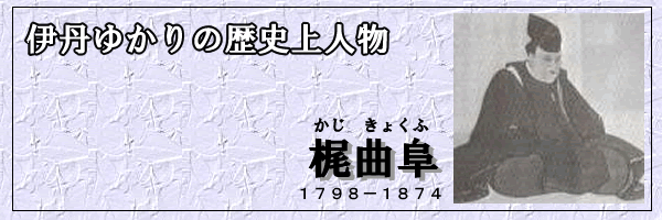 幕末における伊丹俳壇の第一人者。伊丹に生まれ、生涯伊丹暮らし。通称大和田屋金兵衛、照顔斎と号しました。有力酒造家山口家の別家ともいわれています。元来梶家は別姓でしたが、祖父の時代、母方の実家が梶原景時に連なることから梶と名乗るようになりました。猪名野神社の大石灯籠にも大和田屋金兵衛の名が残ります。