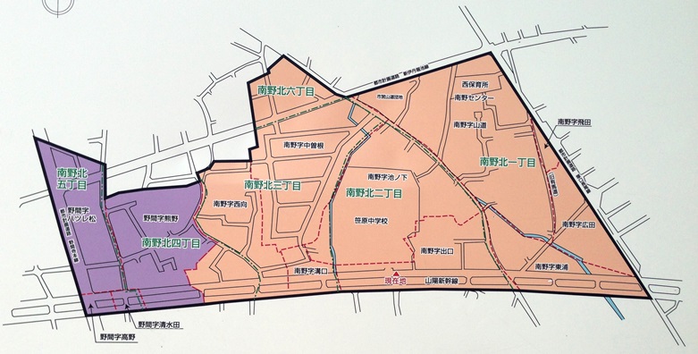 山陽新幹線(昭和47年3月15日新大阪〜岡山間開業)より南側の南野の字地名は、住居表示の実施及び町名変更により、南野1丁目〜5丁目と6丁目の1部、安堂寺町、柏木町および若菱町5丁目となりました。
