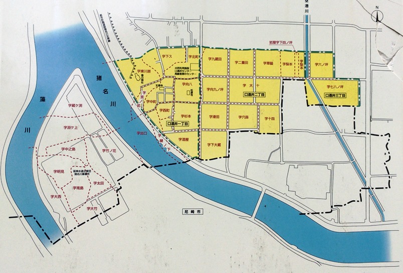 酒井村の名が初めて史料にあらわれるのは、鎌倉時代の嘉元二年(1304)といわれています。猪名川の東岸に位置する当地区は、古くは猪名川の西岸、すなわち猪名川と藻川の中洲にできた村でした。
