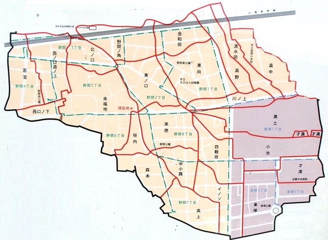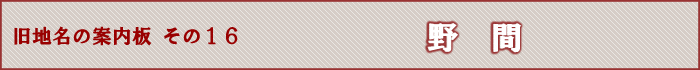 野間村は明治11年(1878)ごろの野間村地図によると、現在の県営伊丹野間団地、笹原小学校、近畿中央病院付近までを区域とし、29の小字に分かれ、それぞれに謂れ(言い伝え)があり、歴史と文化を今日に伝えてきました。