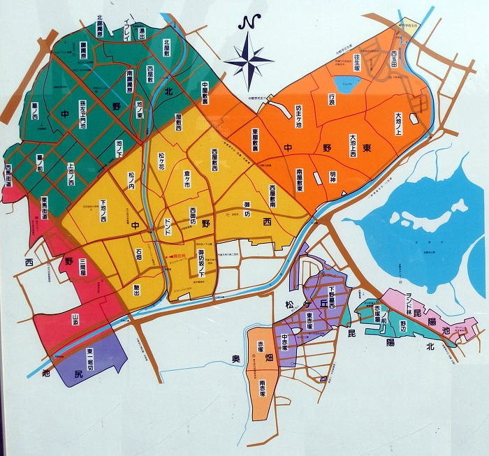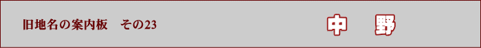 “中野”の名は、原野を開拓してできたためと思われます。村内には孫左衛門池など六つの池がありました。集落は有馬への街道に沿って細長く延びています。綿作が盛んで、文政10年(1827)には田の24%に綿を植えていました。初め幕府領で、貞享3年(1686)から武蔵国忍藩(埼玉県)領、文政6年からは再び幕府領となりました。枝郷として東野と西野があり、村高は合わせて五百八十六石余でした。明治3年(1870)兵庫県に編入、同22年に稲野村の大字となり、昭和15年(1940)に伊丹市中野になりました。