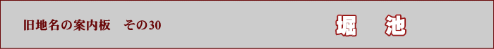 堀池の旧地名に、「字タカセキ」、「字ヒノウチ」、「字水口」がありますが、タカセキ7は「高い堰」、ヒノクチは「樋の口」のことと思われ、「字水口」とともに水利との関わりが考えられます。江戸時代の堀池村は、武庫川から昆陽井(こやゆ)という用水路を通して水を引き、田畑を潤していました。そのほか堀池には、「字ミヨト」、「字登リヲサ」、「字タコハリ」、「字タイト町」、「字ウケハ」、「字ハリノキ」などの旧地名(小字名)があります。