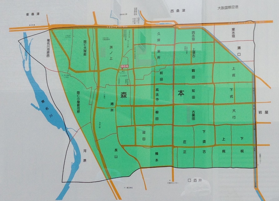 江戸時代の森本村は、始め幕府領、大和国(奈良県)龍田藩領、再び幕府領を経て、寛文2年(1662)からは旗本服部氏の支配地でした。石高は581石余り、明治15年(1882)の戸数70戸、人口は309人でした。農業用水は猪名川から取水した九名井(くめいゆ)と森本井を使いましたが、豊中市域の原田郷などとの水争いが大正時代まで絶えませんでした。