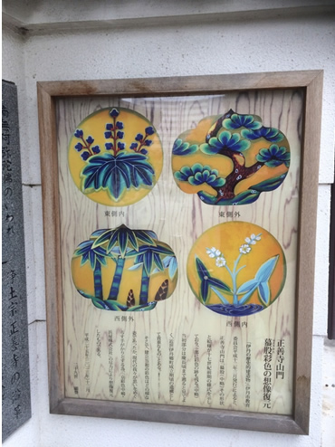 当初は彩色されていたが経年により退色が進み、現在は無彩色の状態である。想像復元した絵柄が門前に掲示してある。
