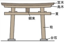 神明鳥居の特徴は最上部の水平材である笠木、およびその下の貫(ぬき)が水平に配置されて反りがなく、柱と同じく円形断面の材料を用いている。