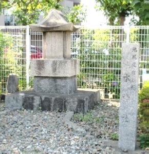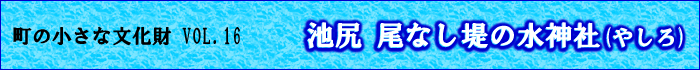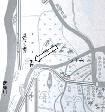 昆陽井の取り口から下流の池尻に向って尾なし堤が築かれている。 尾なし堤の終点、天王寺川が武庫川に合流する地点に水神の御影石の社が鎮座している。傍らの石柱には「池尻尾なし堤 水神社」と印されている。 「明治二年(1869年)池尻村絵図 伊丹古絵図集成本編」には「水神」が記入されているが、それ以前の絵図(例えば幕末期池尻村絵図 同本)には見当たらない。同地図が作成される明治2年の3年前、慶応2年(1866年)に武庫川の 洪水があり、堤防が決壊して池尻村は大被害を 被った。おそらく洪水のあと、水神を鎮めるために社を建立してお祀りするようになったのでは…と想像されます。 |