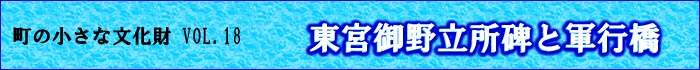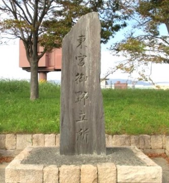 軍行橋東詰堤防の上流側に東宮御野立所の石碑(下河原1 丁目)がある。