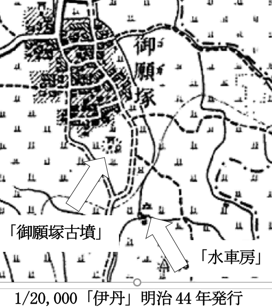 伊丹には他に西国街道と多田道が交差する北村、猪名川左岸の旧中村に「水車房」の記号が地図に記載されている。